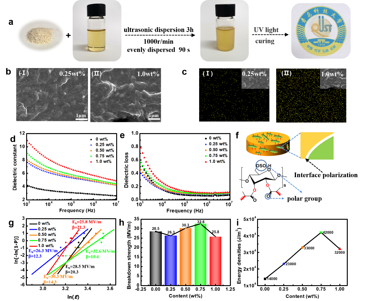 图1. CNCs-MAA/MMPR复合材料的制备及性能表征。(a)高介电复合材料的制备复合方法,(b) CNCs-MAA含量分别为0.25 wt%和1.0 wt%的复合材料断面的SEM图像,(c) EDS表征断面中硫元素的分布,(d) CNCs-MAA/MMPR复合材料在不同CNCs-MAA含量下的介电常数和(e)其介电损耗,(f)复合材料中极性基团和界面效应的示意图,(g)击穿强度的威布尔分析,(h) CNCs-MAA/MMPR复合材料威布尔击穿强度,(i) CNCs-MAA/MMPR复合材料的储能密度。