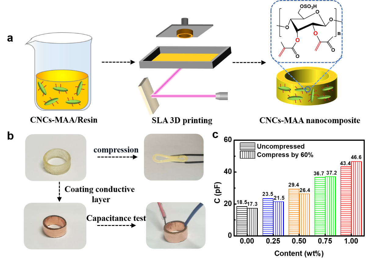 图2. CNCs-MAA/MMPR复合材料的应用尝试。(a)为3D打印环形电容器制备方法。(b) 3D打印复合材料组装环形电容器的过程,电容器具有良好的柔性。(c)不同CNCs-MAA含量下环形电容器无压缩状态的电容(左)和压缩60%的电容(右)。