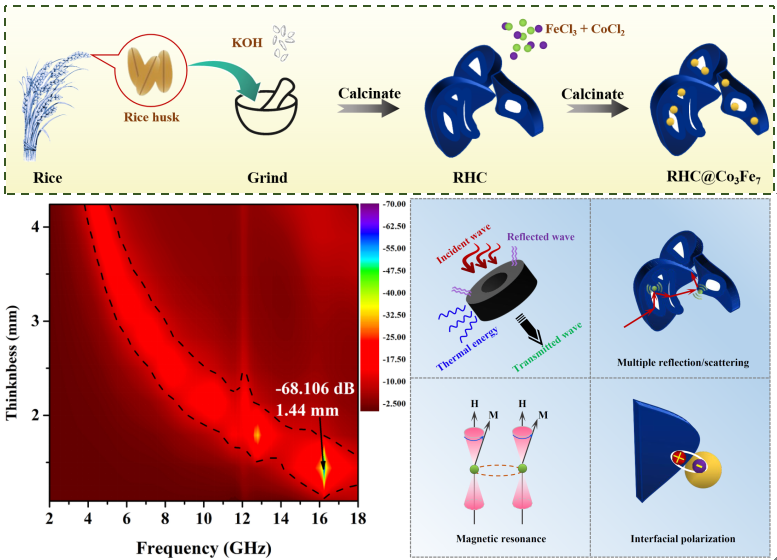 团队以稻壳衍生轻质高比表面积多孔碳(RHC)为载体,成功将Co3Fe7纳米颗粒包埋在RHC的孔隙中,得到了RHC@Co3Fe7纳米复合材料。在多孔结构的多次反射/散射、Co3Fe7纳米颗粒的磁共振以及RHC与Co3Fe7非均匀界面引起的电子极化的协同作用下,在匹配厚度为1.44 mm时,优选样品的最小反射损耗达−68.106 dB。同时,在匹配厚度1.79 mm时,优选样品的最宽有效吸收带宽接近5 GHz。RHC@Co3Fe7纳米复合材料优异的吸收性能,为制备轻质、薄厚度、强吸收、宽带宽的材料提供了一种新的策略。该工作发表在Composites Science & Technology上 (2022, 中科院JCR一区TOP期刊, 影响因子:10.319)。材料学院李镇江教授为第一作者,张猛副教授为通讯作者,beat365正版唯一官网为唯一通讯单位。