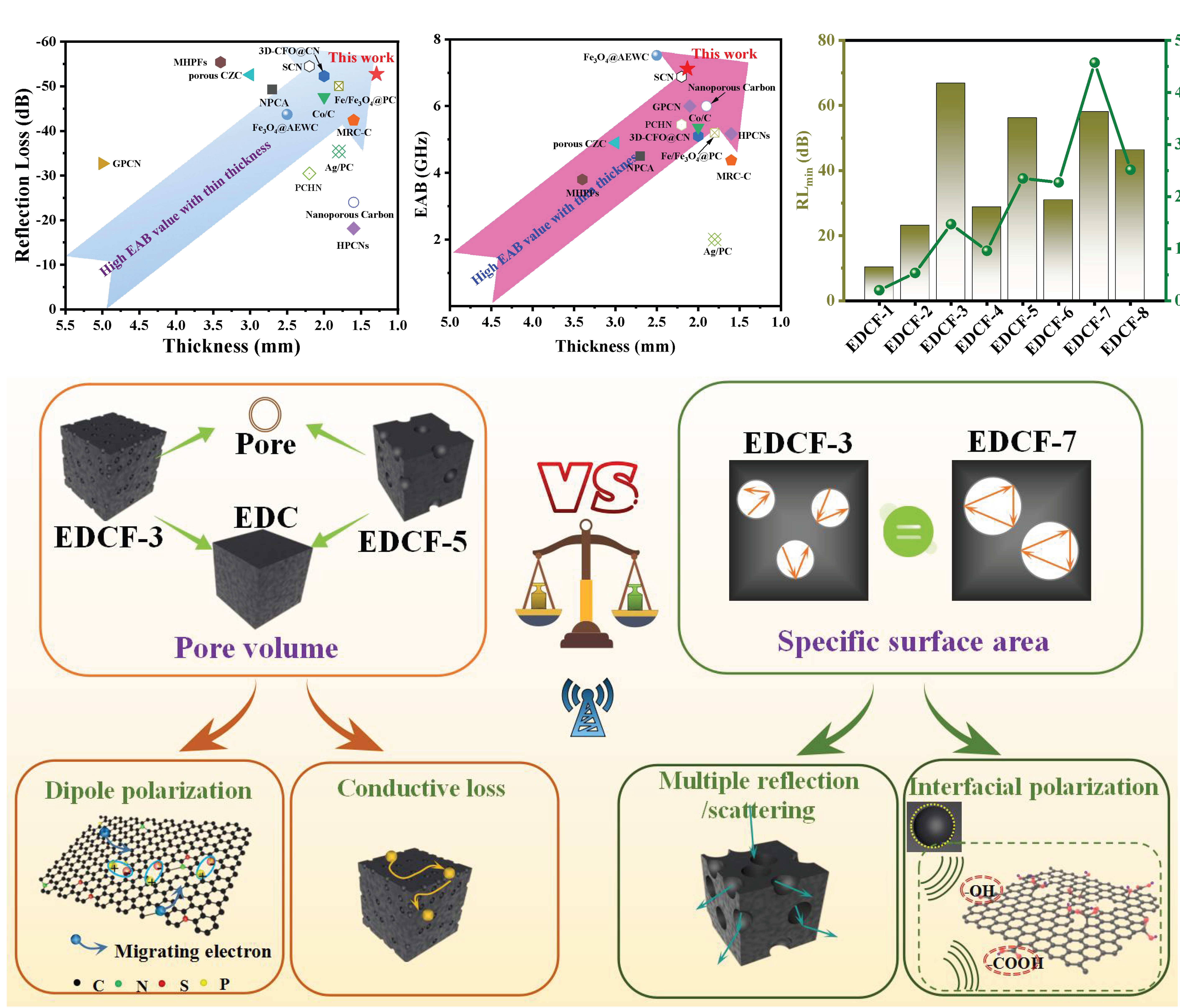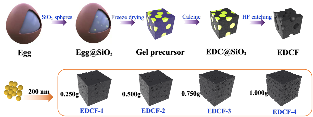 通过碳化配合二氧化硅微球模板刻蚀工艺,团队成功构建出一种新型的超轻鸡蛋衍生三维有序多孔碳泡沫材料(EDCF)。基于等效取代策略,阐明了孔体积和比表面积对产物电磁参数和吸波性能的影响。当填充量为5 wt%时,合成产物(EDCF-3)在2.13 mm厚度下的有效吸收带宽达7.12 GHz,覆盖了整个Ku波段;具有优选孔体积与比表面积的样品(EDCF-7),在1.27 mm厚度时,最强反射损耗达-58.08 dB。该等效取代策略不仅为碳质吸波材料的性能提升开辟了新的思路,而且从客观实验角度阐明了多孔介电吸波材料的主要耗散机制。该工作发表在Nano-Micro Letters上 (2022, 14:157. 中科院JCR一区TOP期刊, 影响因子:23.655)。材料学院张猛副教授为第一作者,李镇江教授为通讯作者,beat365正版唯一官网为唯一通讯单位。