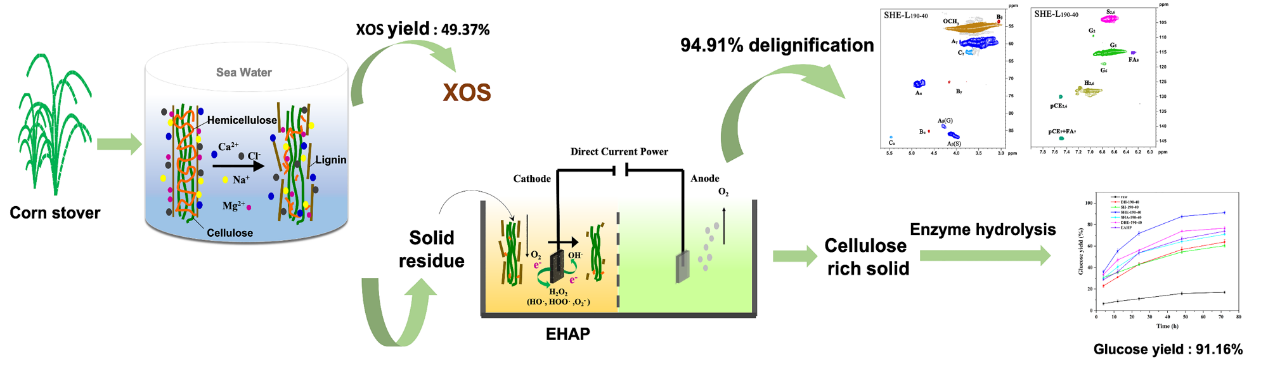 在此基础上,该团队提出了一种新颖的海水水热-电催化两步预处理技术,基于半纤维素优先策略实现了秸秆全组分的精准拆解与高效转化,同时制备低聚糖、可发酵性糖和小分子量木质素化合物,并揭示了主要组分的降解转化机制。相关研究成果以“Promising seawater hydrothermal combining electro-assisted pretreatment for corn stover valorization within a biorefinery concept”为题目,发表在生物质领域国际知名期刊Bioresource Technology (Bioresource Technol.2022, 351:127066. IF= 11.889,中科院一区TOP期刊)。论文第一作者为海洋学院硕士研究生吴越,通讯作者为吉喆副教授,beat365正版唯一官网为第一单位和唯一通讯单位。该项工作得到了国家自然科学基金、山东省重大创新工程的资助。