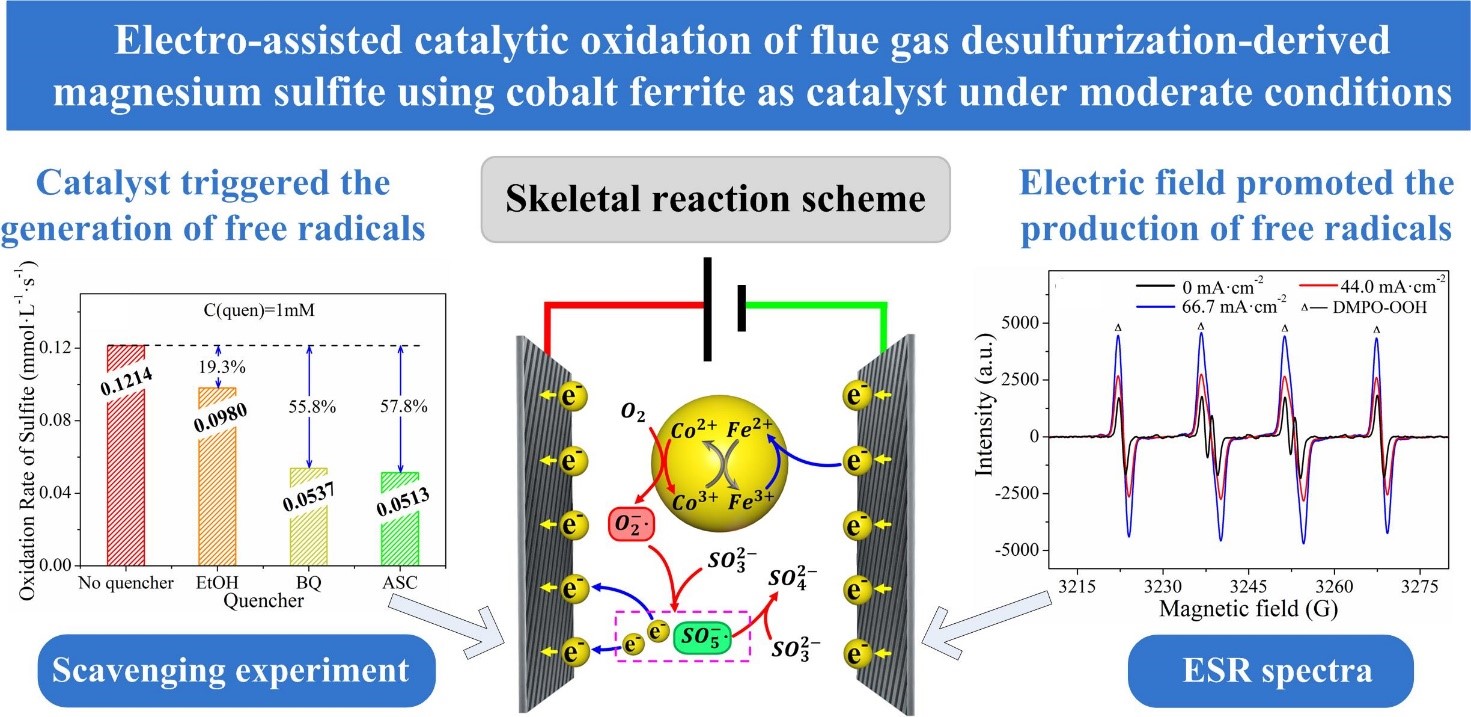近日,化工学院田红景、郭庆杰团队在化学链碳捕获领域取得系列进展。该团队在2021年提出一种基于化学链工艺的硫蒸气还原再生镁基脱硫剂技术(Journal of Cleaner Production,中科院大类一区TOP期刊,影响因子11.072,10.1016/j.jclepro.2020.124720)的工作基础上,继续聚焦在化学链技术耦合脱硫剂再生回收领域,进行了电场强化下高效钴基催化氧化镁基脱硫剂的研究分析。相关研究成果以“Electro-assisted catalytic oxidation of flue gas desulfurization-derived magnesium sulfite using cobalt ferrite as catalyst under moderate condition”为题目,发表在中科院分区环境科学与生态学大类一区TOP期刊Journal of Cleaner Production上(10.1016/j.jclepro.2022.135745)。论文唯一通讯作者为田红景,beat365正版唯一官网为第一单位和通讯单位,田红景副教授被国家留学基金委公派进行博士后研究时的所在单位美国约翰斯霍普金斯大学为第二单位。