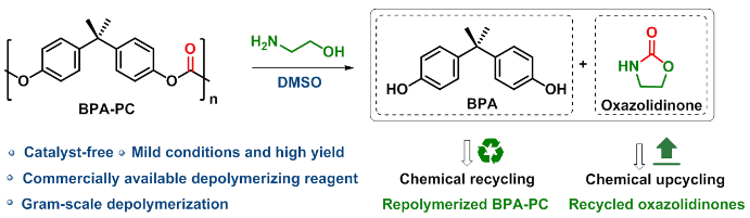 成果一:以“Catalyst-free amino-alcoholysis depolymerization strategy: a facile and powerful tool for chemical recycling of poly(bisphenol A carbonate)”为题目,发表在化学Top期刊Green Chemistry。该研究提出了一种不添加催化剂降解BPA-PC的新方法,以胺醇为降解试剂,实现了BPA-PC的高效升级回收得到聚合单体BPA和高附加值产物2-噁唑烷酮(如图1所示),此外,利用回收单体BPA再次聚合得到BPA-PC,形成BPA-PC材料化学回收的闭环循环。高分子学院硕士研究生周先悦、柴茂青为论文的共同第一作者,孙洪广为第一通讯作者,beat365正版唯一官网为第一通讯单位。
