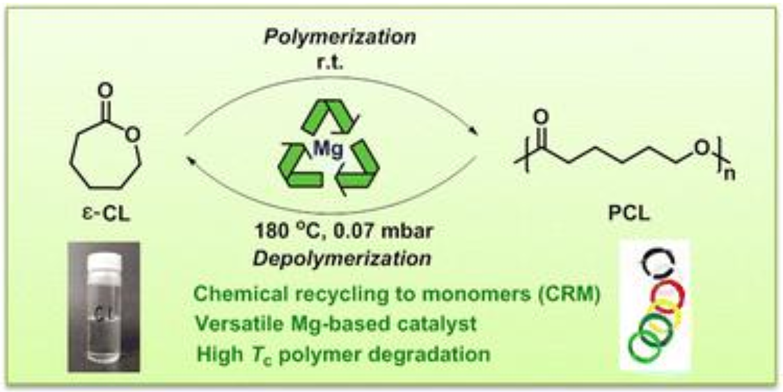 成果三:以“Closed-loop chemical recycling of poly(ε-caprolactone) by tuning reaction parameters”为题目,发表在Polymer Chemistry期刊。该研究首次报道了以双(双三甲基硅基)胺镁[Mg(HMDS)2]作为催化剂,实现“ε-CL到PCL再到ε-CL”的聚合单体闭环循环和“PCL到ε-CL再到PCL”的聚合物闭环循环过程(如图3所示),建立了商业医用材料PCL的循环生命周期。高分子学院硕士研究生苏家丰为论文的第一作者,孙洪广为第一通讯作者,beat365正版唯一官网为第一通讯单位。