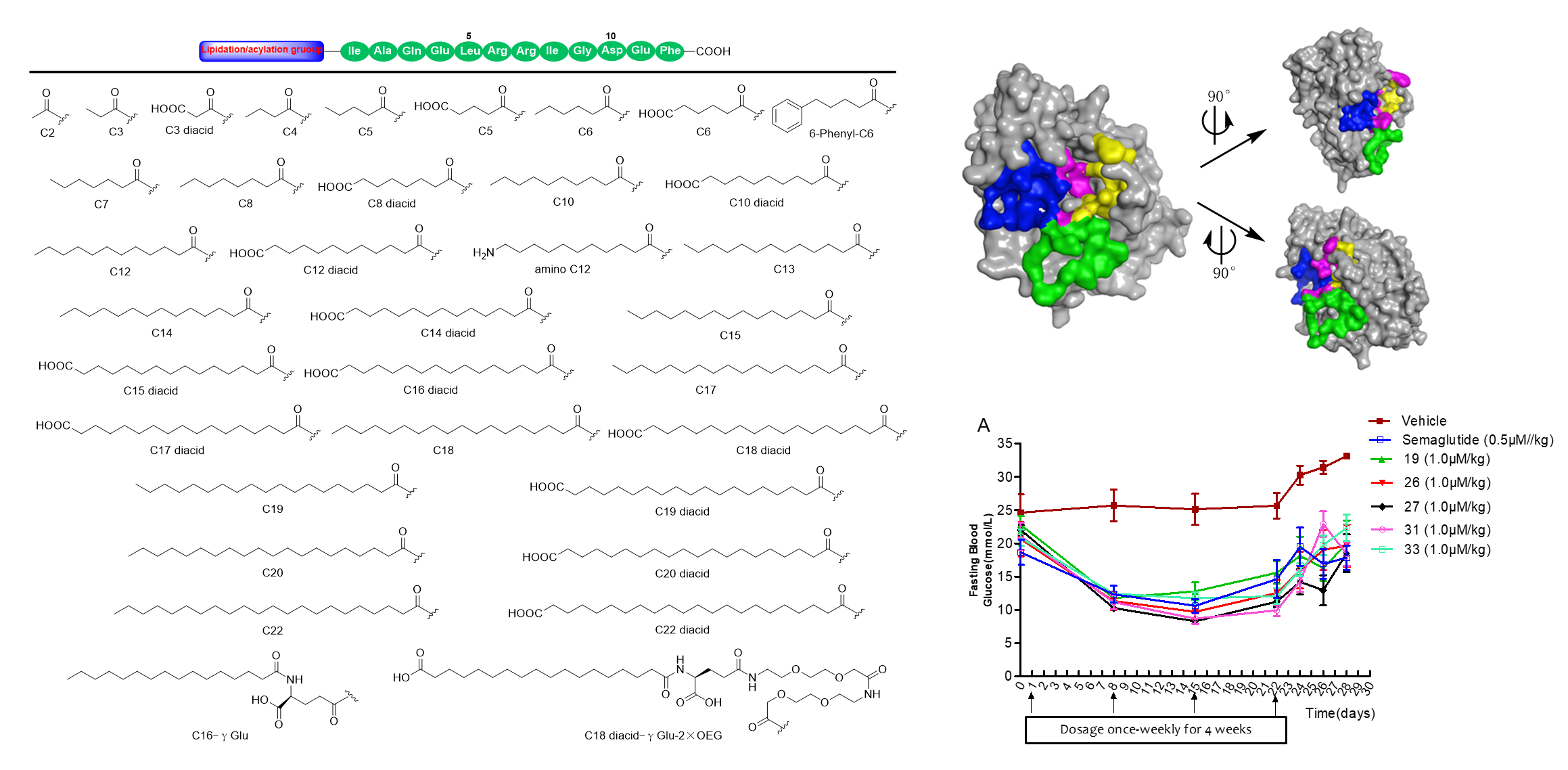 2型糖尿病(T2DM)患者用药依从性差已经成为血糖控制不理想的主要原因之一。一周一次长效降糖药物可以显著改善T2DM患者的便利性、依从性和生活质量,因此越来越受到市场和临床患者的青睐。目前,多肽类一周一次长效降糖药物索马鲁肽、替尔泊肽以其长效稳定的血糖控制效果以及减重、降低心血管风险等功效,已成为全球最畅销的糖尿病治疗药物。然而,相较于传统的降糖药物,GLP-1受体激动剂一周一次长效降糖药价格普遍相对较高,主要原因是它们的序列通常包含30个以上的氨基酸,并与赖氨酸上的复杂侧链相连,导致产品的合成困难,生产成本更高。因此,设计、合成并发现效果好、成本低、用的起的一周一次长效降糖药物,对我国广大的T2DM患者来说仍然是迫切需求。