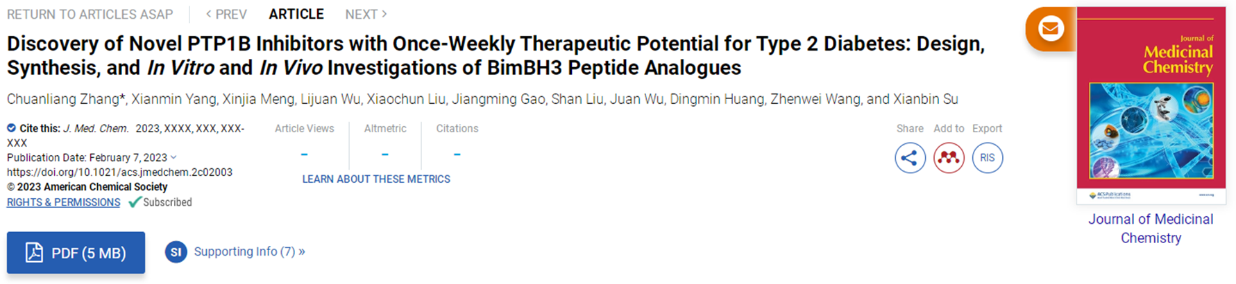 近日,beat365化工学院张传亮团队在新型长效降糖药物设计与发现研究方面取得新进展,相关成果以“Discovery of Novel PTP1B Inhibitors with Once-Weekly Therapeutic Potential for Type 2 Diabetes: Design, Synthesis, and In Vitro and In Vivo Investigations of BimBH3 Peptide Analogues”为题发表在国际药物化学领域顶级期刊《药物化学杂志》(Journal of Medicinal Chemistry)(影响因子8.039,中科院1区Top期刊)。