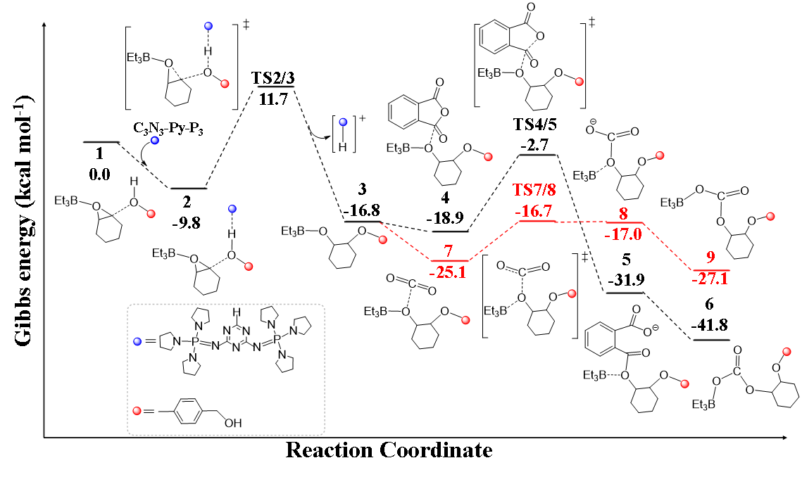 为了深入研究该二元催化体系化学选择性的机理,该团队与吉林大学钟荣林教授合作,利用密度泛函理论DFT计算,研究了C3N3-Py-P3/TEB的化学计量比对催化活性和化学选择性的影响,结果发现化学选择性取决于碳酸盐中间体的稳定性。