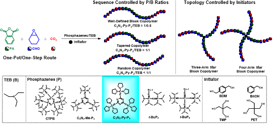二氧化碳CO2和环氧的开环交替共聚(ROAC)是利用可再生、成本低廉的CO2资源的有效策略,同时还可以制备高附加值的CO2基聚碳酸酯材料。但CO2基聚碳酸酯较低的热力学性质和功能性的缺乏限制了它们的应用范围。为了改善CO2基聚碳酸酯的性质,科研人员使用了多种策略,其中通过共聚来构筑不同的链结构是最为有效的方法之一。