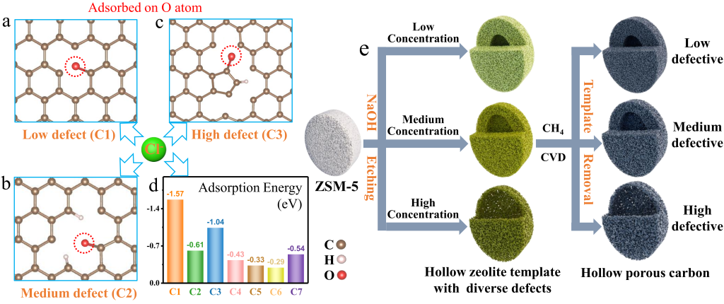 基于此,beat365正版唯一官网材料学院李彬特聘副教授和环境学院王磊教授等人报道了一种空心多孔碳纳米笼(HPC),并在形成的碳缺陷周围控制氧原子周围电子密度,以实现高效的CER。碱刻蚀可使空心结构的沸石产生缺陷。在硬模板策略中,碳缺陷的类型与沸石模板的刻蚀程度直接相关。更重要的是,氧原子可以从沸石框架中“借用”到缺陷碳上。不饱和O原子周围的电子密度在碳低缺陷度上比高缺陷度上低,有利于Cl−的吸附。该催化剂可复制分级沸石结构,具有中空特征和高比表面积。这一优势使其在控制气泡附着状态、有效排斥已形成气泡、增强电解质扩散、降低欧姆电阻和加速反应动力学等方面具有优异性能。结果表明,合成的HPC纳米笼具有良好的电催化性能,在电流密度为10 mA cm−2的条件下,过电位低至94 mV,稳定性好且优于商用贵金属催化剂DSA,是目前已报道的碳材料中最好的。