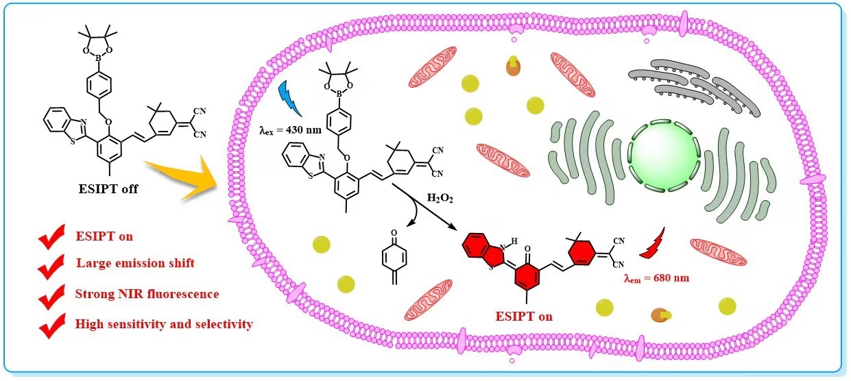 过氧化氢(H2O2)是生物体内常见的活性氧物种之一,对细胞信号传导、机体免疫反应等正常生理功能的实现具有重要作用,被视为是阿尔兹海默症、肿瘤、心血管疾病、亨廷顿病和帕金森病等多种疾病的重要生物标志物。近日,海洋科学与生物工程学院王晓春教授团队在国际著名期刊《Sensors and Actuators B:Chemical》(JCR中科院一区Top)发表了题目为“H2O2-targeted ratiometric chemosensor with long-wavelength emission and large emission shift based on ESIPT mechanism for bioimaging application”的研究论文(Sensors & Actuators: B. Chemical,2023,393,134301)。该论文第一作者为课题组2020级硕士研究生陈瑾,王晓春教授为独立通讯作者,beat365正版唯一官网为独立通讯单位。