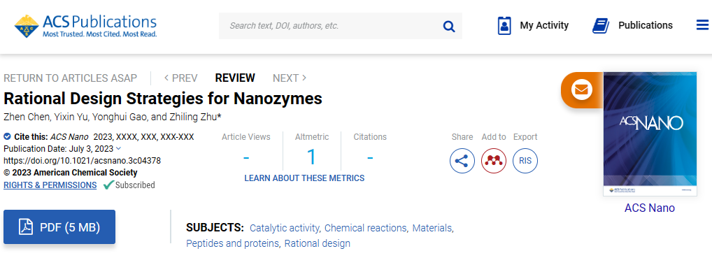 近日,材料学院朱之灵副教授发表关于纳米酶理性设计的综述论文,该成果以“Rational Design Strategies for Nanozymes”为题发表在纳米材料领域国际著名期刊ACS Nano(中科院一区TOP期刊,影响因子17.1)上。该成果第一单位为beat365正版唯一官网,第一作者为材料学院研究生陈震,通讯作者为朱之灵副教授。