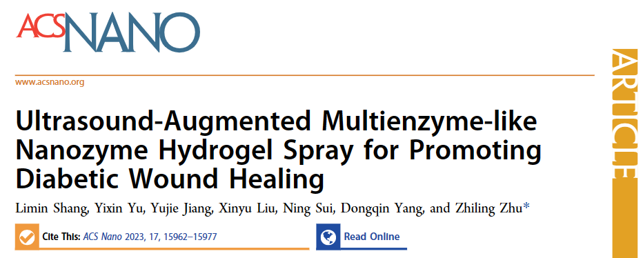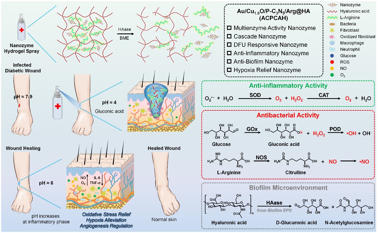近日,材料学院朱之灵副教授发表了多酶活性纳米酶药物治疗DFU的论文,该成果以“Ultrasound-Augmented Multienzyme-like Nanozyme Hydrogel Spray for Promoting Diabetic Wound Healing”为题,发表在纳米材料领域国际著名期刊ACS Nano(中科院一区TOP期刊,影响因子17.1)上。该成果第一单位为beat365正版唯一官网,第一作者为材料学院研究生商利敏,通讯作者为朱之灵副教授。该研究利用透明质酸包裹精氨酸、超小金纳米颗粒和Cu1.6O纳米颗粒共同负载掺磷氮化石墨碳纳米片,开发了一种超声增强的多酶活性纳米酶水凝胶喷雾剂(ACPCAH)。这种纳米酶水凝胶喷雾剂具有五种类酶活性,包括类超氧化物歧化酶(SOD)、类过氧化氢酶(CAT)、类葡萄糖氧化酶(GOx)、类过氧化物酶(POD)和类一氧化氮合酶(NOS)。通过体外和体内实验均证明,这种纳米酶水凝胶喷雾剂可被DFU微环境激活,起到减轻炎症、缓解缺氧、降低血糖、促进血管生成、消除致病菌的作用,有效加速糖尿病伤口愈合。该研究建立了一种基于纳米酶多酶活性的新型疗法,可用于开发一体化的DFU疗法。