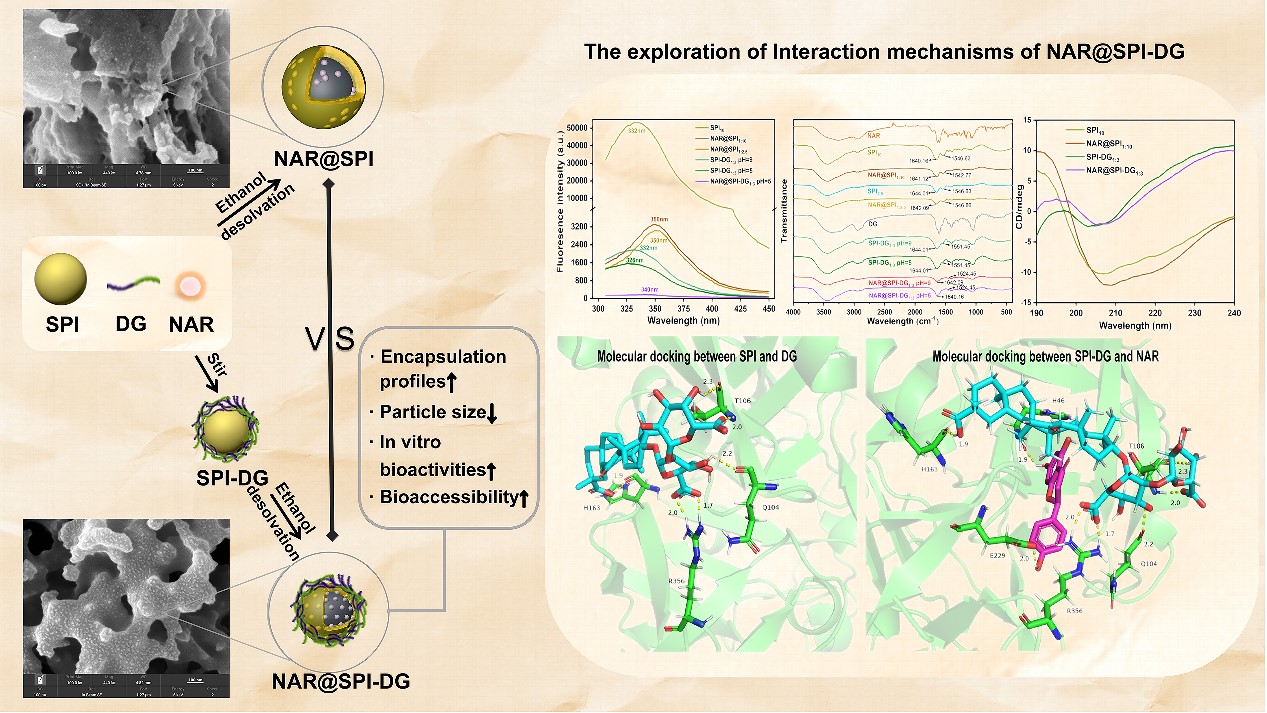 为提高甘草酸的装载效率,作者进一步用蛋白质对甘草酸进行修饰,获得大豆蛋白-甘草酸复合物这一新型复合载体,进一步包载活性成分柚皮素,显著改善被包封活性成分的溶解度、抗氧化活性、抗糖尿病活性、生物可及性等特性。相关成果以“Obtention, interaction, and characterization of the soy protein isolate-glycyrrhizin nanocomplex for encapsulating naringenin”为题发表在食品领域高水平期刊《Food Hydrocolloids》(https://www.sciencedirect.com/science/article/pii/S0268005X23006562)。