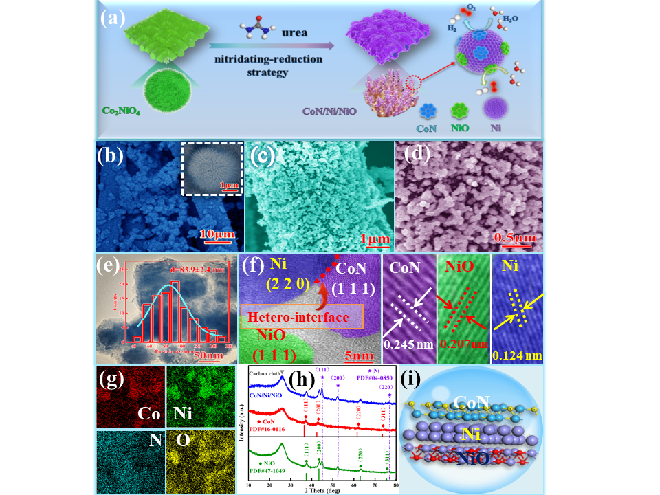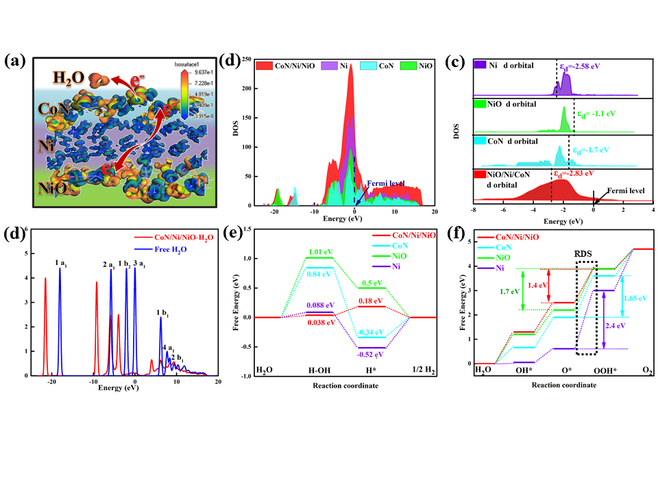 此外,探索了新型CoN/Ni/NiO双功能催化剂在电催化裂解水方面的应用。研究发现CoN与Ni/NiO可以构建CoN/Ni界面,从而暴露出更多的活性位点,因此CoN/Ni/NiO催化剂在析氢反应、析氧反应中展现出了优异的催化性能。在1.0 M KOH,电流密度为10 mA cm−2条件下,过电位为92 mV(HER)和114 mV(OER),电池电压低至1.56 V可以驱动水全分解。通过DFT密度泛函理论计算表明,从Ni到CoN的电子转移能够有效增加费米能级附近Co的d轨道电子态密度,提高氢和氧的吸附效率,提高电催化性能。