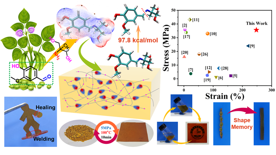 针对此问题,团队提出了一种新型的韧性调控策略,利用电子离域效应和协调交联点的设计,在对材料增韧的同时降低力学强度的损失。借助刚性苯环与亚胺键的共轭互补影响电子云分布,有效降低了交联网络中亚胺键交换的能垒,亚胺键解离能可从170.75 kcal/mol降低到97.80 kcal/mol。在相同温度下,动态共价键的交换速率加快,更有利于材料在现实条件下的功能化。团队所合成的vitrimer材料具有良好的焊接、愈合和形状记忆性能。该工作以“Functional bio-based vitrimer with excellent healing and recyclability based on conjugated deflection self-toughening”为题发表于化工领域Top期刊《Chemical Engineering Journal》(https://doi.org/10.1016/j.cej.2023.145680),beat365正版唯一官网为论文的第一单位,化工学院高传慧教授为通讯作者,2021级硕士研究生陈丕成为第一作者。