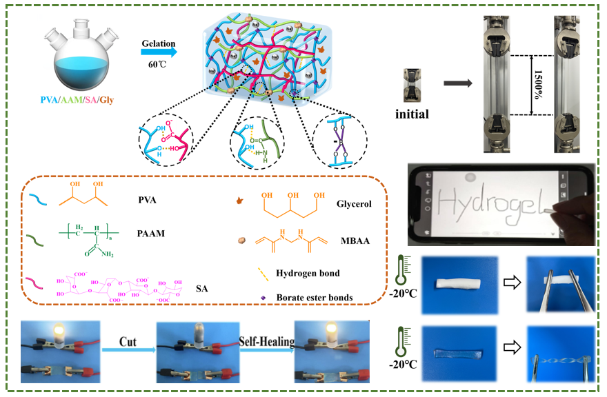 该团队同步开展了三维结构复合凝胶网络的设计及多重可逆作用构建研究,获得了可逆键与作用力形式对聚丙烯酰胺/聚乙烯醇等复合网络在机械性能、自修复性能及防冻保湿性能等方面的影响机制。