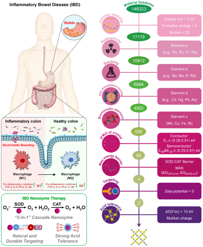 这项工作首次建立了一套高效的高通量计算筛选策略,通过数据挖掘、标准筛选、密度泛函理论(DFT)计算以及分子动力学(MD)模拟,将多方面的治疗需求转换为数字化的材料特征。在超过146323种无机材料(MaterialsProject)数据库中,通过九个阈值层级,包括材料稳定性、放射性、溶解度、肠道微生物毒性、仿生天然酶元素、iFMO、反应能垒、负Zeta电位和耐酸性,筛选出适用于IBD治疗的纳米酶Ni3S4。