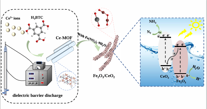 NH3作为一种理想的能源,已广泛应用于农业、工业、医药等领域。目前工业上仍采用Haber-Bosch工艺合成NH3,条件苛刻,且排放大量CO2。光催化固氮是一种很有前途的氨合成方法,可以在温和环保的条件下利用太阳能完成。陶旭梅团队以Ce-MOFs为前驱体,通过热处理合成了氧空位工程Fe2O3/CeO2Z型异质结。表面氧空位与Z型异质结的协同作用不仅促进了N2的吸附和活化,而且使电荷快速分离和转移,从而增强了光催化固氮性能。本研究揭示了通过缺陷和异质结结构提高光催化固氮效率的原因,为利用耦合缺陷和异质结效应实现可见光低成本固氮合成NH3提供了一些见解。