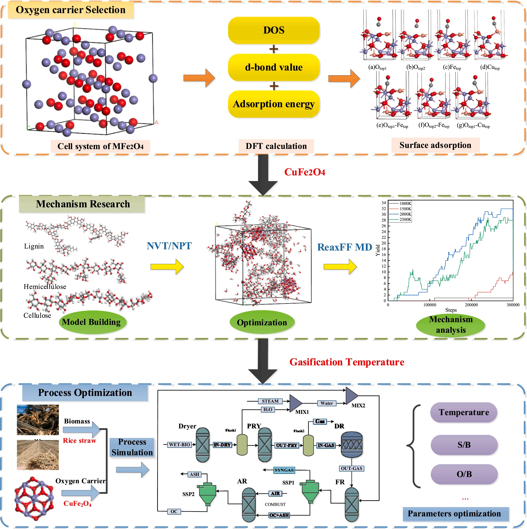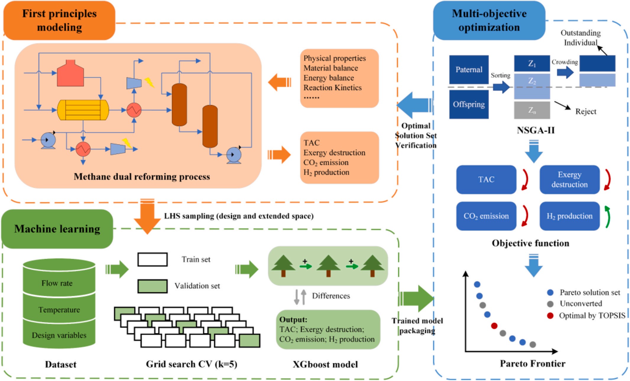 文章分别提出了基于复合载氧体选择的生物质化学链气化过程多尺度优化策略(如图1)、基于机器学习代理模型构建的甲醇重整过程多目标优化策略(如图2)、基于流程建模与智能筛选的煤焦油化学链气化动态优化控制策略、基于动态模拟与深度学习的煤制乙二醇过程废水智能溯源策略及基于流体力学建模的火炬气回收工艺优化设计策略。采用分子模拟与流程模拟、理论计算与实验测试的多尺度、多策略的新型融合式研究手段,旨在实现复杂化工过程的平稳高效运行。以上5篇文章均以beat365正版唯一官网为第一单位,田文德教授、刘彬讲师分别为论文的通讯作者,崔哲副教授、博士研究生刘子健、博士研究生李哲、硕士研究生孙阳、硕士研究生范晓敏分别为论文的第一作者。