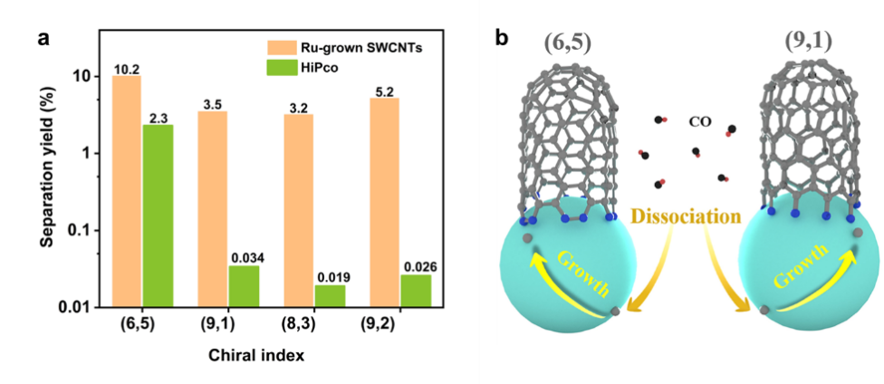 图(a)单壁碳纳米管的高分离效率和(b)生长动力学示意图。