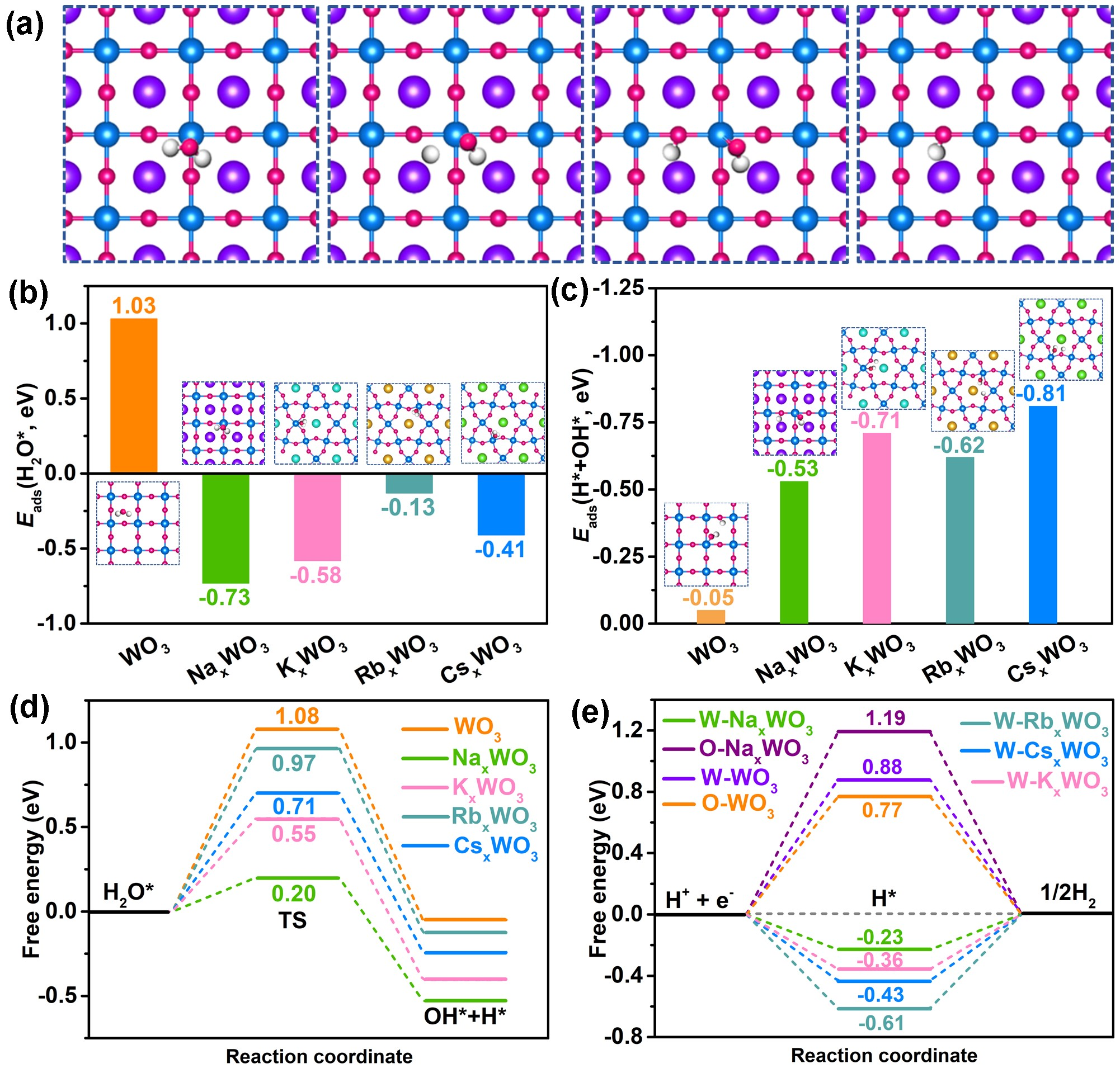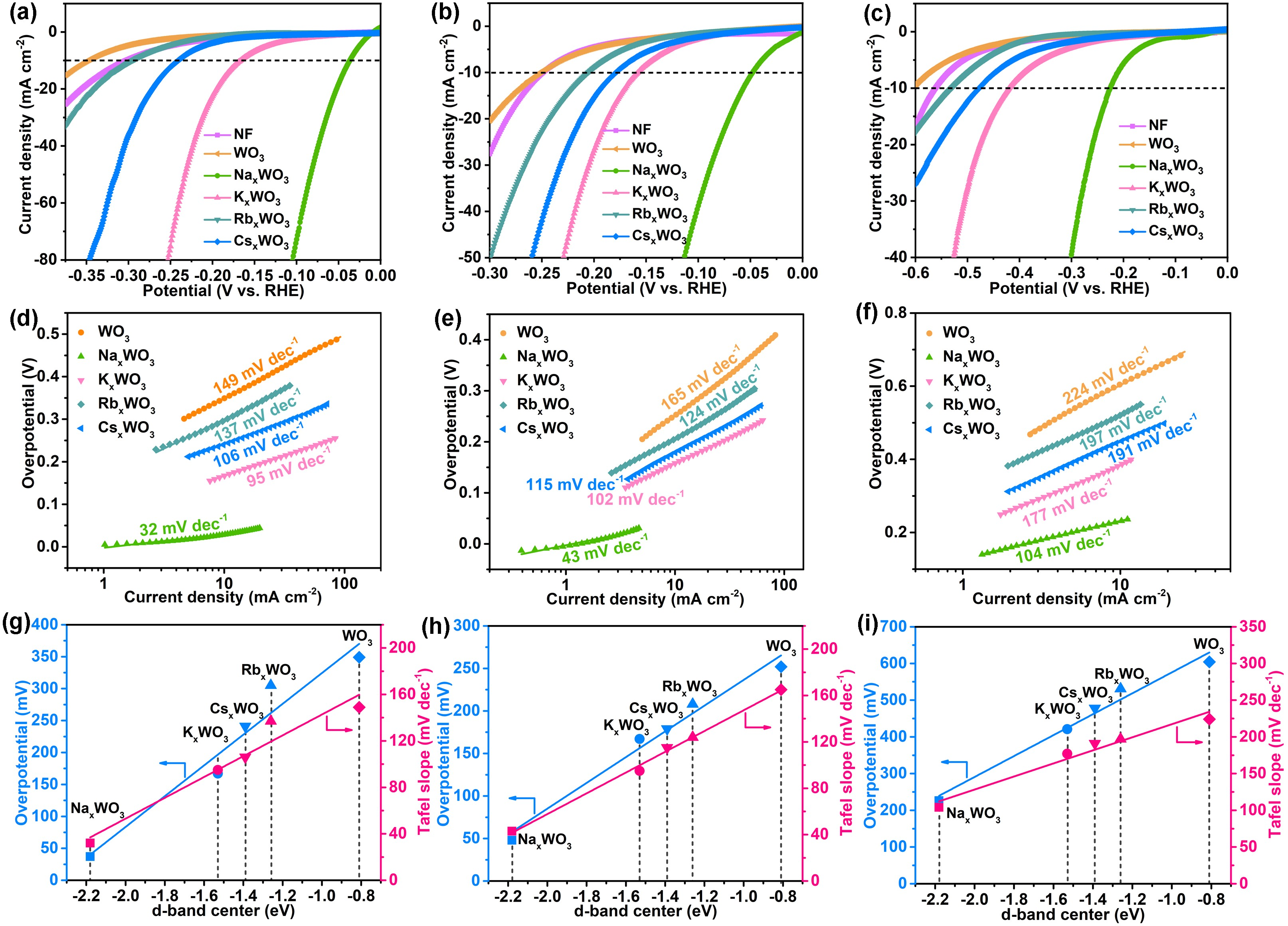 为满足各种电解槽对不同类型电解质的应用需求,设计开发能够在宽pH范围内具有优异析氢活性和稳定性的非贵金属电催化剂具有重要意义。最近,本团队首次开发了一种新型高效的非贵金属基全pH析氢催化剂——钠钨青铜多孔八面体(图1)。该催化剂能够在酸性、碱性和中性海水电解质中均具有类似商业铂碳催化剂的析氢活性,在10 mA cm-2时的过电位仅分别为37、48和256 mV(图2)。DFT计算表明,Na离子的引入使NaxWO3具有最优的电子结构和金属导电性,进而促进了水的吸附/解离动力学和氢吸附自由能(图3)。该工作首次揭示了碱金属离子在钨青铜中电催化析氢反应中的作用机理,有望为析氢反应和其他能量储存与转化反应催生一类新的非贵金属催化剂。上述成果发表于国际知名期刊Nano Energy(中科院1区TOP期刊,影响因子16.7),刘光波副教授为论文第一作者,姜鲁华教授为论文通讯作者,beat365正版唯一官网为论文第一完成单位。