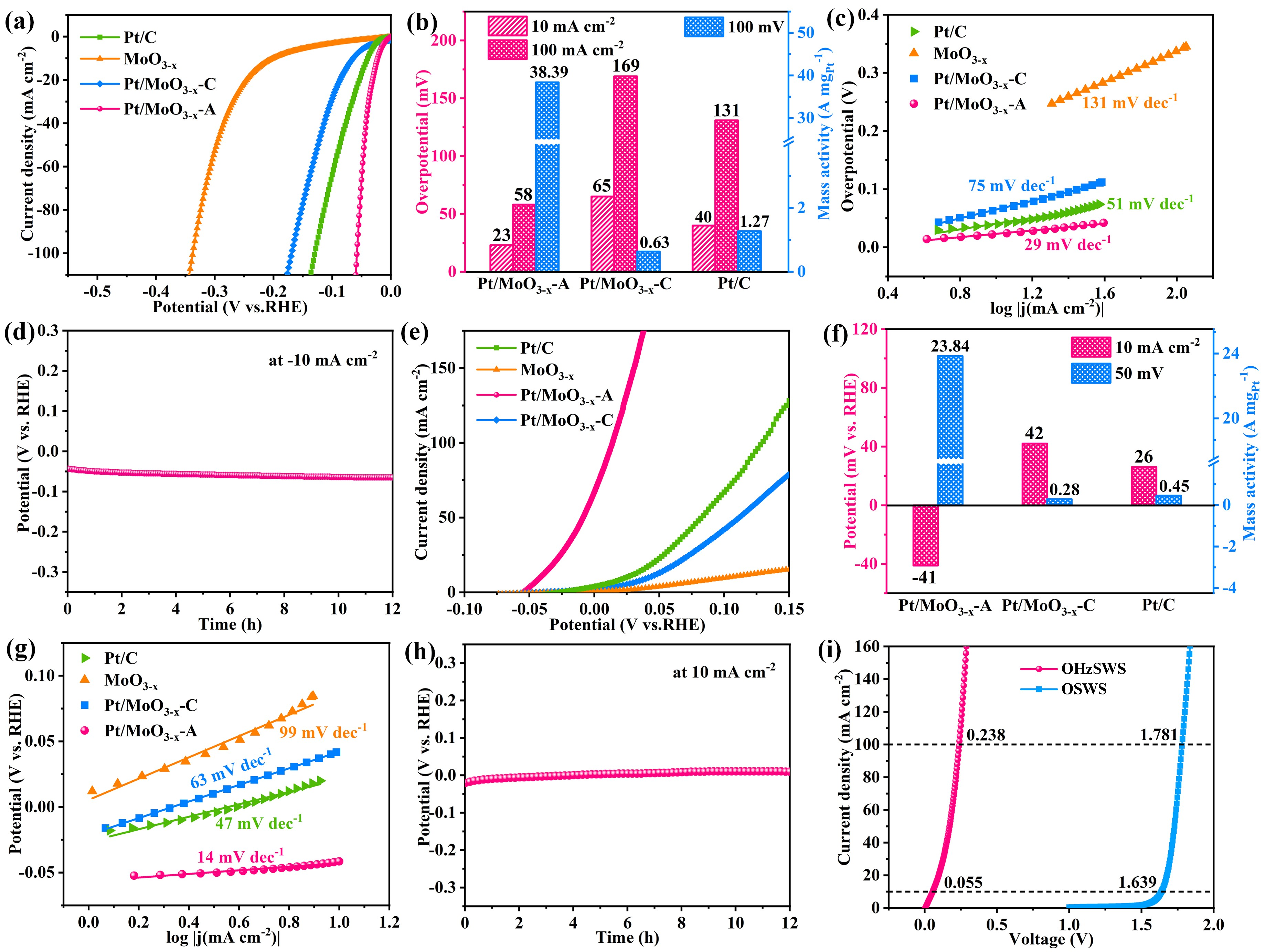 电解海水制氢面临着严重的阳极动力学缓慢、氯氧竞争反应和电极腐蚀等问题。对此,该团队近期以含Pt杂原子的多金属氧酸盐为前驱体,通过水热法设计合成了一种具有晶态/非晶态界面的Pt/MoO3-x催化剂(图4)。该催化剂在海水介质中具有优异的析氢-肼氧化双功能催化活性,有效解决了海水电解过程中阳极析氧反应动力学缓慢、氯氧竞争反应及电极腐蚀等问题。研究表明,将晶态/非晶态Pt/MoO3-x作为析氢-肼氧化双功能催化剂用于肼辅助海水分解(OHzSWS)时,电解槽在获得10和100 mA cm-2时的工作电压仅分别为55和238 mV,比传统电解海水系统(OSWS)的工作电压分别降低了1.584和1.543 V,显示了巨大的低能耗节能制氢优势(图5)。该成果发表于国际知名期刊Chemical Engineering Journal(中科院1区TOP期刊,影响因子15.1),硕士研究生权清豪为论文第一作者,刘光波副教授和姜鲁华教授为论文通讯作者,beat365正版唯一官网为论文第一完成单位。
