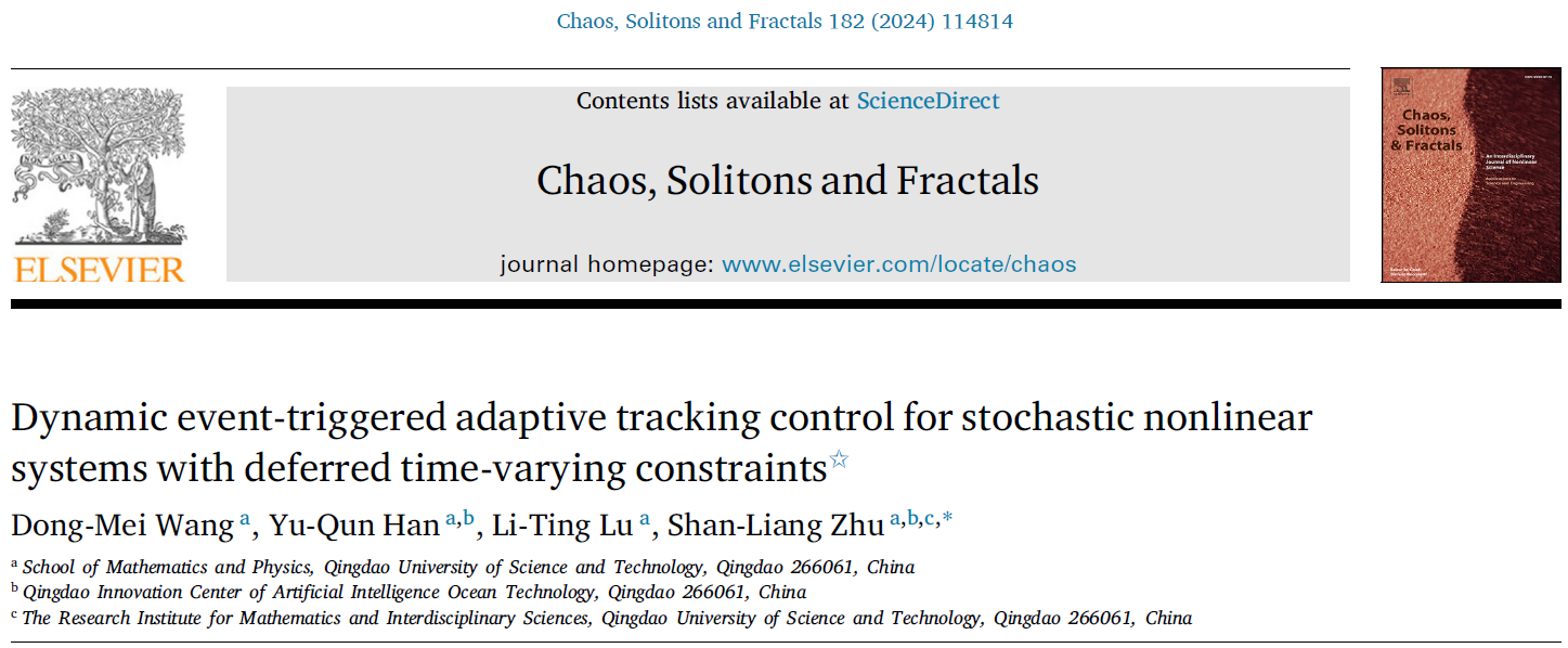 近日,数理学院朱善良和韩玉群团队在智能控制领域取得新进展,相关成果以“Dynamic event-triggered adaptive tracking control for stochastic nonlinear systems with deferred time-varying constraints”为题发表在国际著名期刊Chaos, Solitons and Fractals(中科院数学1区,影响因子7.8)。朱善良副教授为本文的通讯作者,数理学院硕士研究生王冬梅为第一作者。该研究beat365正版唯一官网为第一通讯单位,获得了山东省自然科学基金项目的资助和支持。文章链接:https://doi.org/10.1016/j.chaos.2024.114814.