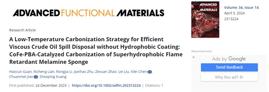 近日,环境学院焦传梅/陈希磊团队报道了构筑超疏水火安全海绵和实现高效油水分离的相关进展。利用仿生设计、界面组装技术、低温碳化策略等技术方法制备了多种具有超疏水、火安全、光热等功能的海绵复合材料,在高效油水分离领域实现了重大突破。在材料学科顶级期刊Advanced Functional Materials(IF: 19)上发表了1篇题目为“A low-temperature carbonization strategy for efficient viscous crude oil spill disposal without hydrophobic coating: CoFe-PBA-catalyzed carbonization of superhydrophobic flame retardant melamine sponge”的文章;在安全科学与工程学科顶级期刊Journal of Hazardous Materials(IF: 13.6)上发表了两篇题目分别为“MOF-derived LDH modified flame-retardant polyurethane sponge for high-performance oil-water separation: Interface engineering design based on bioinspiration”和“A biomimetic design for efficient petrochemical spill disposal: CoFe-PBA modified superhydrophobic melamine sponge with mechanical/chemical durability and low fire risk”的文章。