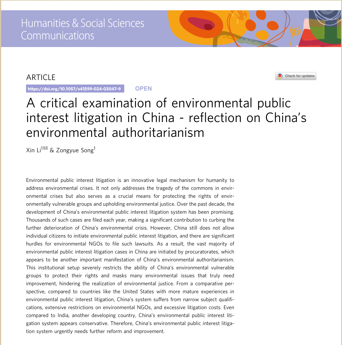 日前,学校法学院李鑫教授团队在Humanities & Social Sciences Communications期刊2024年5月发表学术论文“A critical examination of environmental public interest litigation in China - reflection on China’s environmental authoritarianism”。该论文的第一作者&通讯作者为李鑫教授,第二作者为李鑫教授指导的硕士研究生宋宗越。Humanities & Social Sciences Communications(《人文与社会科学通讯》)为Social Sciences Citation Index(SSCI)以及Arts& Humanities Citation Index(A&HCI)两个权威数据库源刊,致力于人文科学、社会与行为科学所有领域的高水平研究,具有良好的全球影响力。Humanities & Social Sciences Communications(《人文与社会科学通讯》)位于国际JCR分区一区,中国科学院期刊分区社会学大类二区。