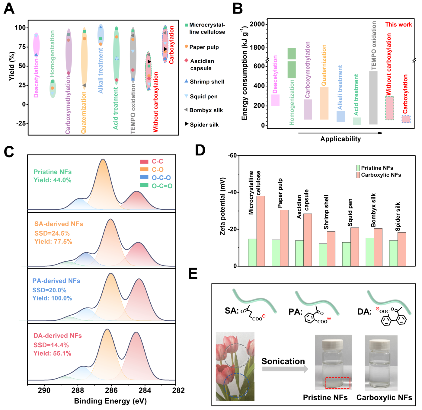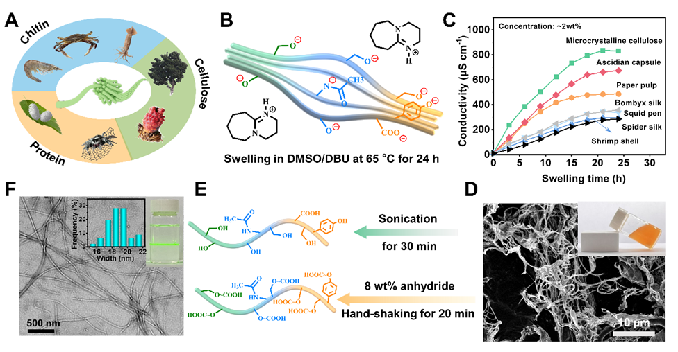 近日,beat365正版唯一官网张建明团队陈玉伟副教授与中国科学院青岛能源所李朝旭研究员等合作开发了一种具有普适性的生物质纳米纤维绿色制备方法。该制备方法主要利用1,8-二氮杂双环[5.4.0]十一碳-7-烯(DBU)的二甲亚砜(DMSO)作为一种通用的、可回收的、非侵入性的去质子化溶剂体系,对不同多糖或氨基酸基生物质材料进行夺质子化处理,并配合后期高压均质等强物理剪切作用制备生物质纳米原纤维。同时,依赖于DBU的酯化催化特性,该溶剂体系还可以活化生物质表面羟基,促进其与酸酐反应制备羧基化纳米纤维。