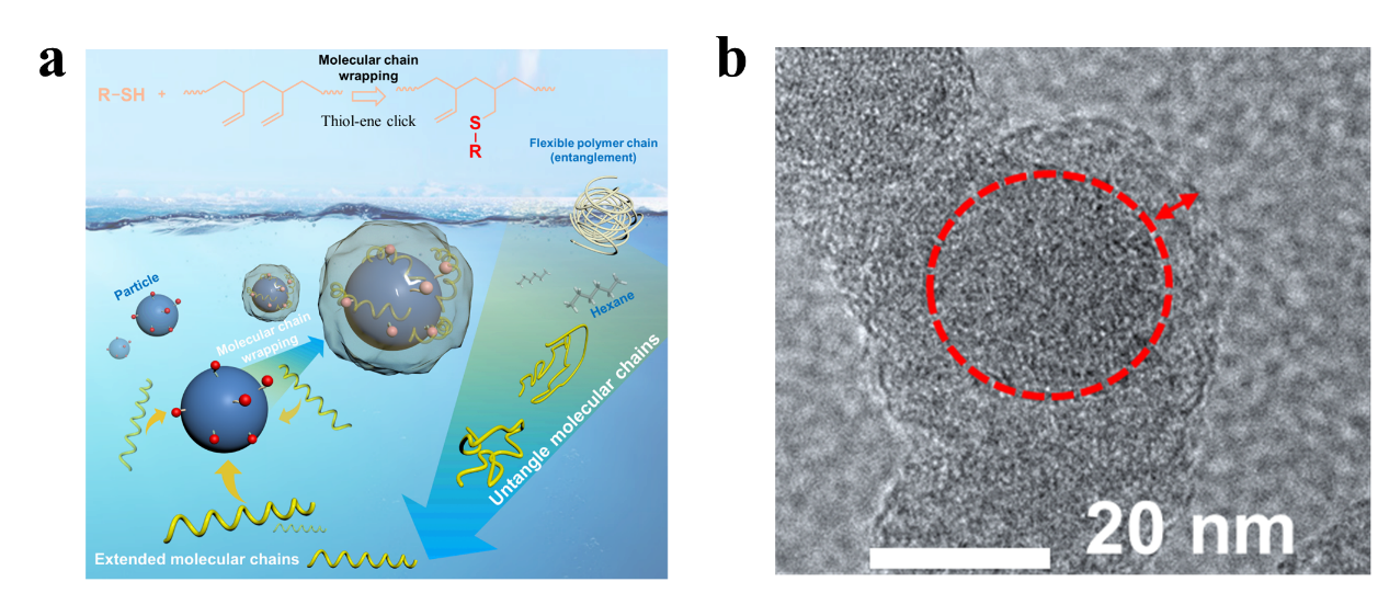 研究者首先利用溶剂小分子将聚丁二烯高分子链进行解缠结。利用柔性高分子链对无机粒子产生环绕效应实现无机粒子的有效包覆,并利用排除体积控制其包覆厚度达到疏水改性效果。进一步采用反应定位能力强和反应高效快速巯基-烯点击反应将高分子链迅速铆钉在粒子表面,实现粒子超长效的疏水能力。