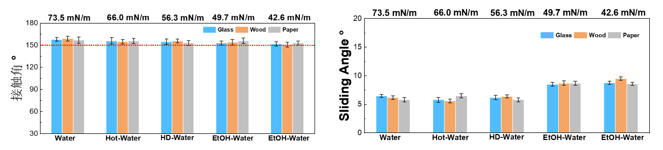 可以实现对低表面能(42.6 mN/m)液体良好的拒液能力,接触角均可达到150°以上,如图。这可满足绝大部分的油水混合场景(>45 mN/m)所需要的拒液要求。