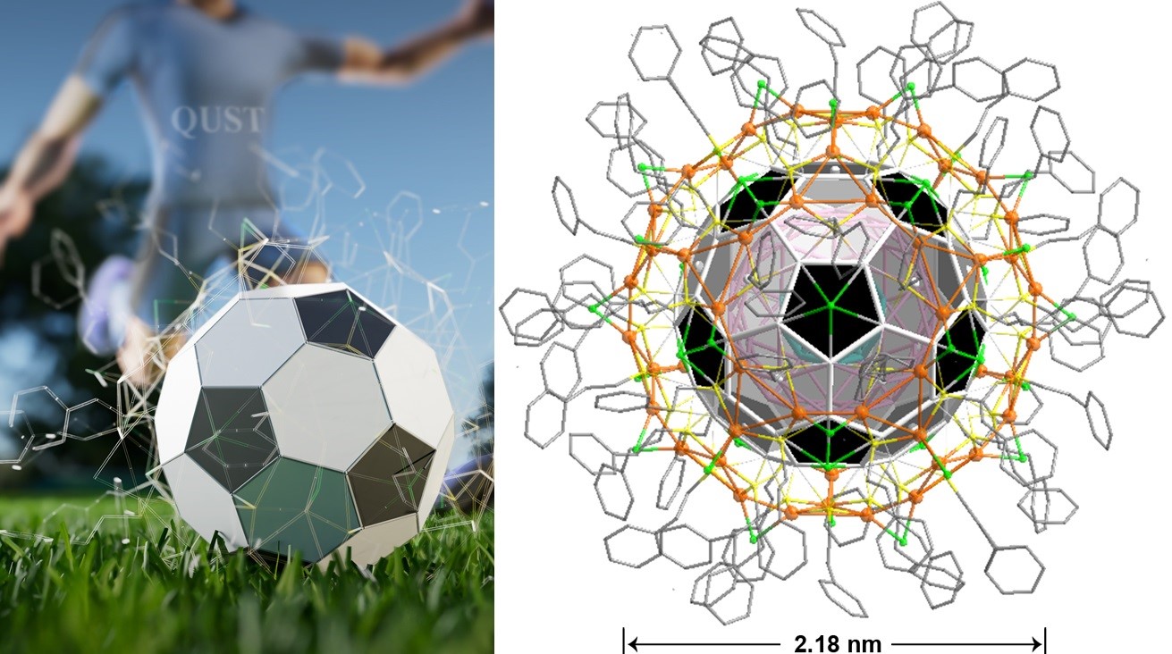 近日,beat365汪恕欣教授团队报道了迄今为止最大的具有确定结构的Ag-Cu合金纳米团簇—Ag135Cu60(S(CH2)2Ph)60Cl42(以下简称Ag135Cu60),该纳米团簇具有一个世界上最小的Ag质足球形内核(图1),并且兼具分子和金属状态。相关成果以“Structure and optical properties of an Ag135Cu60 nanocluster incorporating an Ag135 buckminsterfullerene-like topology”为题,于2025年1月14日在线发表于Nature Synthesis期刊。