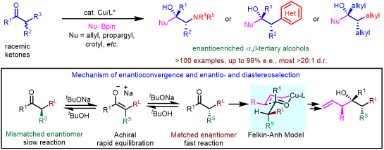 羰基的烯丙基化和炔丙基化是有机合成中应用最广泛的碳碳成键反应之一,产物中的烯烃和炔烃官能团易于进行众多重要的转化。不对称烯丙基化和炔丙基化是构建手性叔醇非常高效的方法。烯丙基或炔丙基的有机金属试剂对α-手性酮的非对映选择性亲核加成是构建α,β-手性叔醇结构最直接的方法,但该方法的非对映选择性较难控制。因此,发展高效和高立体选择性的消旋酮的烯丙基化、炔丙基化和丁烯基化反应构建含有连续多个手性中心叔醇结构的方法是化学合成领域的重要挑战性研究前沿。
