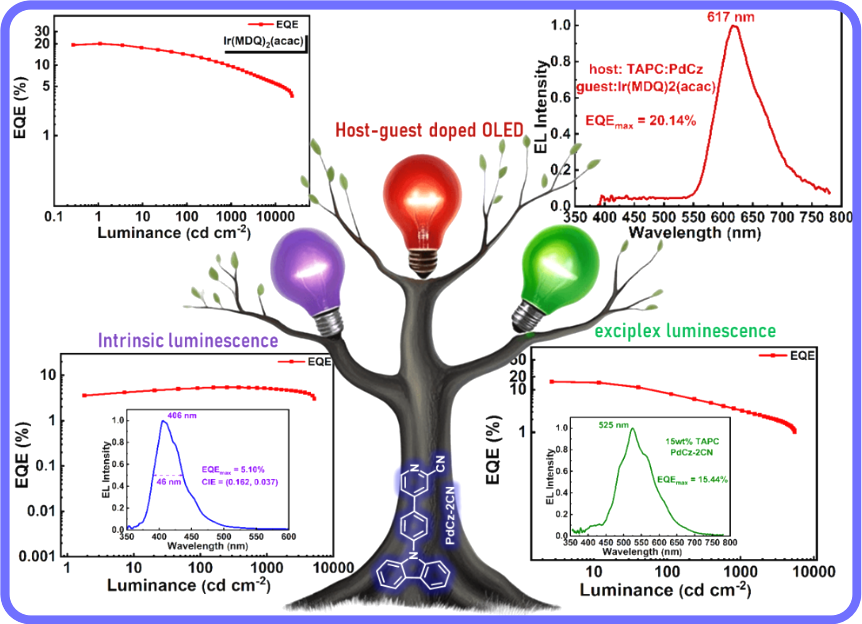 本工作提出了短共轭分子设计策略来实现超深蓝发射,通过选择具有良好空穴传输能力的咔唑基团作为电子给体,具有暴露在外围杂原子的2-吡啶甲腈作为电子受体以保证载流子迁移率的平衡,苯为共轭π桥以避免形成强电荷转移态,保证超深蓝发射,创新性地设计合成了具有短共轭结构的PdCz-2CN和mPdCz-2CN两种新型发光材料。材料表现出优异的热稳定性,并通过理论计算和光物理实验验证了其HLCT和超深蓝发射的特性。重要的是,PdCz-2CN还可以与常用空穴传输层TAPC形成绿光发射的激基复合物,并表现出高效的热活化延迟荧光特征,提供了多种能应用的基础。基于PdCz-2CN或mPdCz-2CN为发光层的非掺杂器件,实现了最大外量子效率(EQEmax)分别为5.42%,2.05%,对应CIE色坐标为(0.159, 0.062),(0.160, 0.064),接近超高清显示标准BT.2020的蓝光要求。其中,以CBP为主体,PdCz-2CN为客体的掺杂器件色纯度显著提升,CIE坐标优化至(0.162, 0.037),EQEmax保持在5.10%。而基于PdCz-2CN与空穴传输材料TAPC形成的激基复合物作为发光层时的非掺杂激基复合物器件的EQEmax突破至15.44%,发射峰位于525 nm,这可与先进的非掺杂激基复合物OLED器件效率相媲美。并且,以该激基复合物为主体,红色磷光材料Ir(MDQ)₂(acac)为客体的器件EQEmax高达20.14%,发射峰位于617 nm,这展示出PdCz-2CN具有多功能应用的潜力。该研究首次将2-吡啶甲腈引入超深蓝HLCT材料设计,突破传统材料色域限制,同时通过激基复合物策略实现“一材多用”,为全彩OLED显示提供新思路。该成果有望满足BT.2020标准的高色域需求,助力超高清显示技术的发展。
