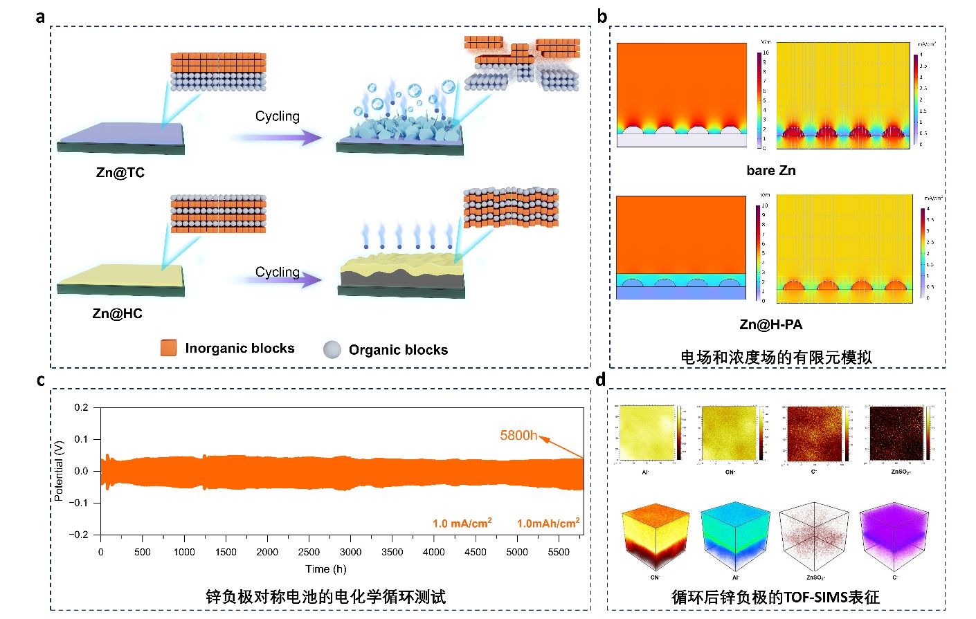 结合TOF-SIMS、深度XPS刻蚀、AFM等表征技术,该工作深入解析了复合界面的电化学演变,解析了界面电化学性能与界面机械性能之间耦合关系。以上成果以“Artificial organic-inorganic hybrid interface enables reversible Zn anodes”为题发表在Nano Energy期刊。化工学院教师木天胜为第一作者,朱晓东教授为通讯作者。以上研究得到了国家自然科学基金、山东省自然科学基金、山东省泰山学者等项目的资助。