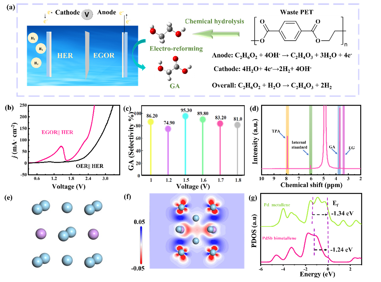 该研究工作报道了简便的溶剂热法制备具有p-d轨道杂化特性的缺陷丰富的褶皱结构PdSb双金属烯催化剂。值得注意的是,PdSb双金属烯在乙二醇(EG)氧化过程中表现出优异的活性和选择性,在0.75 V电位下,乙醇酸(GA)的法拉第效率为93.4%,选择性为92%。此外,作者还设计了一种膜电极组件(MEA)流动池,将阳极的高性能乙二醇氧化反应(EGOR)与阴极的析氢反应(HER)耦合在一起。实验结果表明,在EGOR||HER系统中,PdSb双金属烯能氧化PET衍生物乙二醇生成GA选择性为95.30%。理论计算表明,PdSb双金属烯通过p-d轨道杂化效应促进了表面电子的转移,从而实现了高效的EGOR。该研究为p-d轨道杂化双金属烯合成和内在催化机制提供了见解,还为PET水解产物转化为高附加值产品以及节能制氢技术的发展提供有效策略。