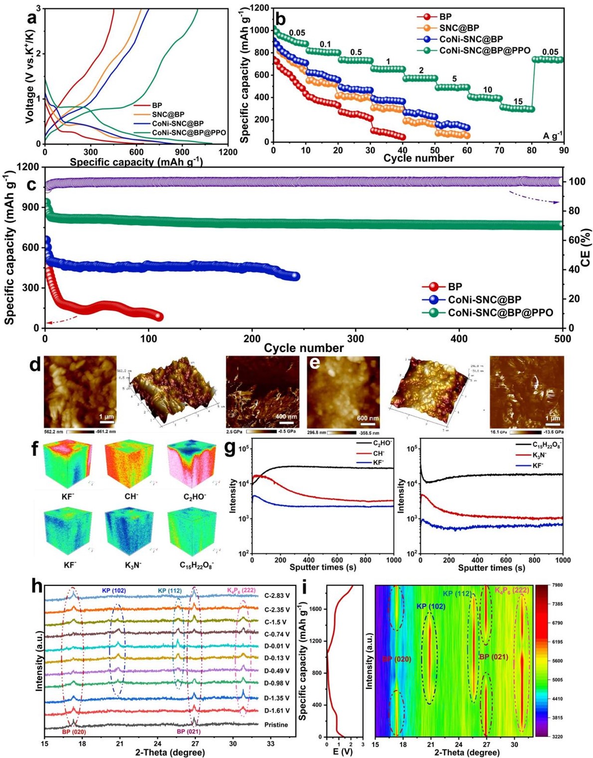 图3. a) 0.05 A·g⁻¹下的充放电曲线,b)倍率性能,c)在1 A·g⁻¹下的循环性能,d)放电至0.01 V时BP和e) CoNi-SNC@BP@PPO的原子力显微镜(AFM)拓扑图像,f) BP(上)与CoNi-SNC@BP@PPO(下)选定二次离子碎片的三维渲染可视化图,g) BP(左)与CoNi-SNC@BP@PPO(右)在负离子模式下的飞行时间二次离子质谱(ToF-SIMS)深度剖面曲线,h)不同电压状态下的非原位X射线衍射(Ex-situ XRD)曲线,i)原位X射线衍射(In-situ XRD)曲线。