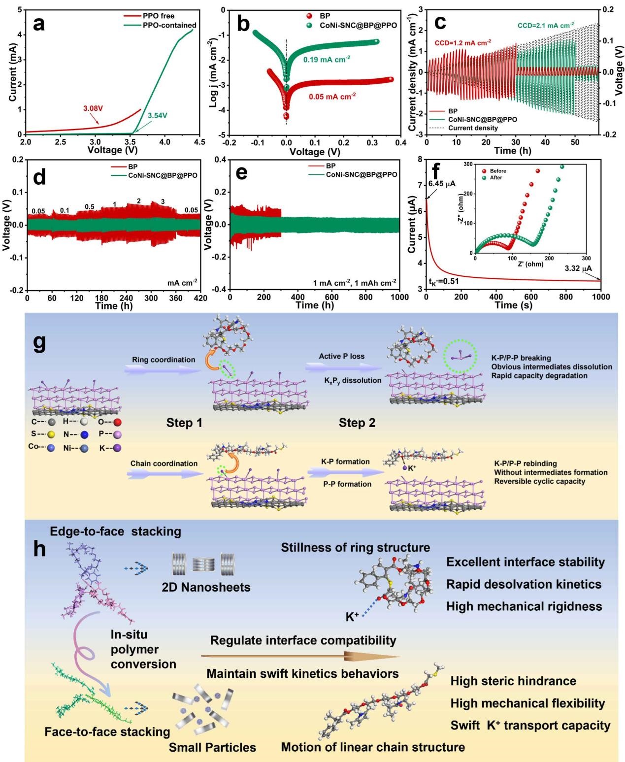 图4. a)线性扫描伏安(LSV)曲线,b)塔菲尔(Tafel)曲线,c) BP复合物的临界电流密度(CCD),d)不同电流密度下对称电池的倍率性能,e)电流密度为1 mA·cm⁻²、比容量为1 mAh·cm⁻²条件下对称电池的电压曲线,f)对称电池的电流-时间曲线(插图为极化前后电化学阻抗谱EIS),g)静态-动态集成策略调控中间体溶解机制示意图,h) PPM原位转化为PPO的示意图及优势。