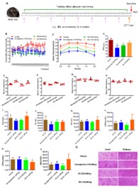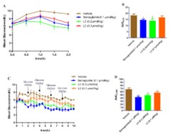 进展二:脂肪酸化修饰虽能延长BH3多肽半衰期,但会降低水溶性,影响药物递送。因此,亟需一种既能提升肽类稳定性和长效性,又能改善其溶解性的新策略。基于此团队开发了“糖脂双修饰”技术,通过同时引入脂肪酸化和糖基化修饰,优化BimBH3肽的理化性质和药理活性。在BimBH3肽的N端连接棕榈酸(C16)或十八烷二酸(C18),并在Lys²侧链引入糖基(如唾液酸、半乳糖醛酸),显著提升水溶性(L3的溶解度提高10倍)和蛋白酶稳定性(抗DPP-IV降解能力提升4.4倍)。优化后的化合物L3在保持PTPN1抑制活性的同时,血浆半衰期延长至11.4小时(较原型肽提高9.85倍),解决了传统脂肽溶解性与稳定性不可兼得的矛盾。L3在口服葡萄糖耐量试验(OGTT)中表现出与司美格鲁肽相当的降糖效果,且长效性可持续10小时,支持其作为每周一次给药的潜力。同时,L3在口服糖耐量试验中持续改善胰岛素敏感性,也为开发口服肽类药物奠定基础。通过糖基化与脂肪酸化的协同作用,首次实现了BimBH3肽类抑制剂在溶解性、稳定性及生物活性上的全面优化,为开发靶向PTPN1的口服和长效抗糖尿病药物提供了新思路。双修饰策略的普适性也为其他肽类药物的设计提供了重要参考。
