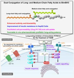 糖尿病是全球高发的代谢性疾病,开发长效、高效、无副作用的抗糖尿病药物是当前重大需求。传统多肽药物面临半衰期短、细胞膜穿透性差、溶解度低等瓶颈,尤其针对细胞内靶点(如蛋白酪氨酸磷酸酶PTPN1/2)的药物设计更是挑战。蛋白酪氨酸磷酸酶PTPN1/2是调控胰岛素和瘦素信号通路的关键细胞内靶点,但其高度保守的带负电活性位点使得传统小分子药物难以有效靶向,被认为是“不可成药”靶点。肽类药物在代谢疾病治疗中表现出巨大潜力,但面临膜通透性差、半衰期短和易被酶降解等问题。尽管脂肪酸修饰(如长链脂肪酸)可延长肽类药物的半衰期(如GLP-1受体激动剂司美格鲁肽),但其对细胞内靶点的通透性提升有限。因此,开发兼具长效性和细胞通透性的肽类抑制剂仍是当前研究的难点。
