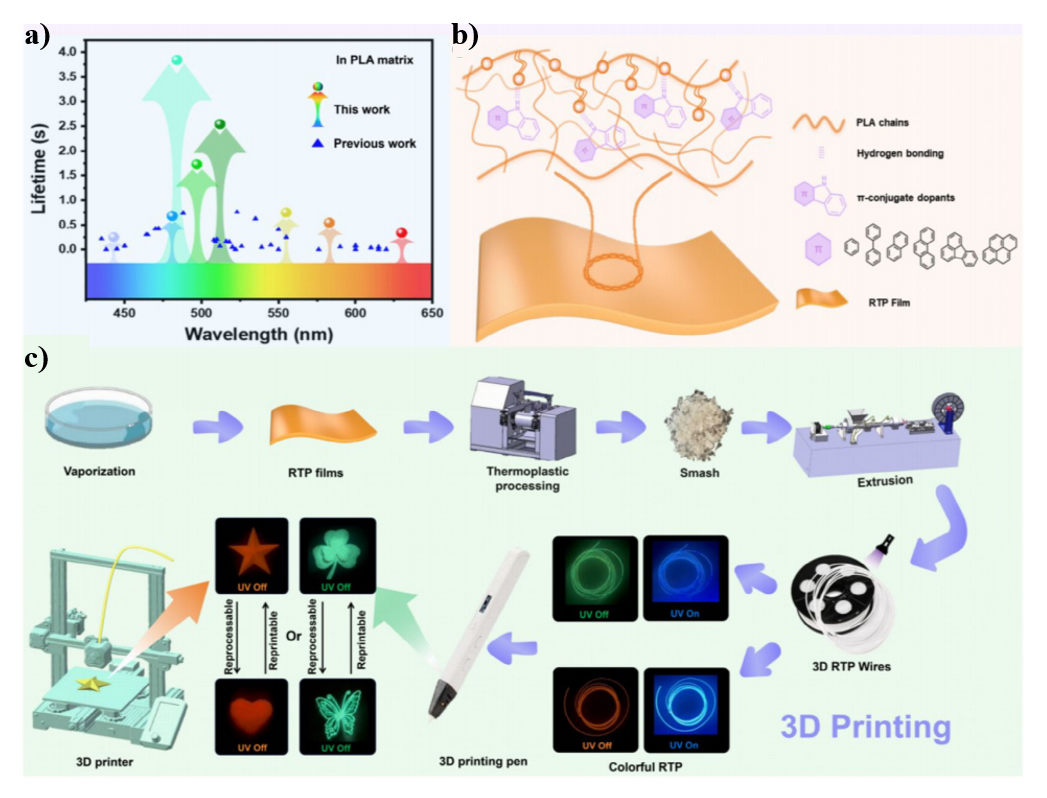 图1.a) 本工作取得的与现有报道的PLA基RTP材料寿命对比。b) 磷光掺杂剂结构及其在PLA中的分散与相互作用机制示意图。c) 本工作的材料制备流程及其多彩余辉和3D打印物体示意图。