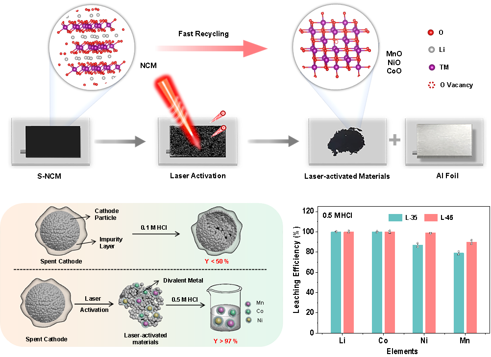 随着锂离子电池(LIBs)商业化规模的不断扩大,废旧LIBs的数量也显著增加。而废旧LIBs具有环境风险和资源价值的双重属性,因此,废旧LIBs的回收对于可持续资源管理和环境保护至关重要。火法冶金和湿法冶金是目前主要的回收方法,但这两种方法通常依赖于高温熔炼或强酸/碱,导致了严重的环境污染以及较高的成本。此外,上述方法在回收战略性金属时效率较低,且回收周期长。因此,为实现战略金属资源的可持续循环利,研究团队提出了一种快速、高效、环境友好且成本可控的激光回收策略。