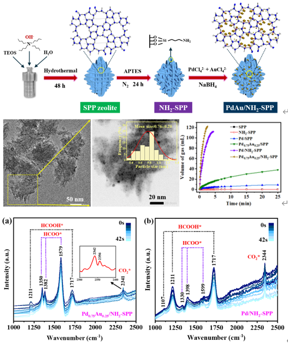 制备低成本、高性能的催化材料是实现甲酸制氢系统规模化应用的关键技术问题。我们围绕高效异相催化剂构筑开展了系统研究,在前期工作基础上(Journal of Energy Chemistry, 2021, 59:455-464;Applied Surface Science, 2020, 512: 145746;International Journal of Hydrogen Energy, 2020, 44(55):30396-30403;Molecular Catalysis, 2023, 545: 113204),本研究采用具有多级孔道结构的自支撑SPP沸石作为载体,其交织的纳米片结构提供了丰富的介孔和外表面,有效避免了微孔扩散限制。借助表面嫁接的-NH2基团与金属前驱体阴离子之间的强吸附作用,成功将PdAu合金以平均尺寸0.76 nm的超细纳米簇锚定在载体表面,所制备的Pd0.75Au0.25/NH2-SPP催化剂在室温条件下初始转化频率高达3607 h⁻1,氢气选择性100%,性能位居已报道Pd基催化剂前列。XPS分析证实,载体表面的-NH2基团作为电子给体,促使电子向PdAu合金簇转移,电子重构过程形成富电子的Pd活性中心,显著促进了甲酸脱氢过程中C–H键的断裂。原位ATR-IR分析证实反应遵循甲酸盐(HCOO*)路径并进一步提出了PdAu协同催化机制。