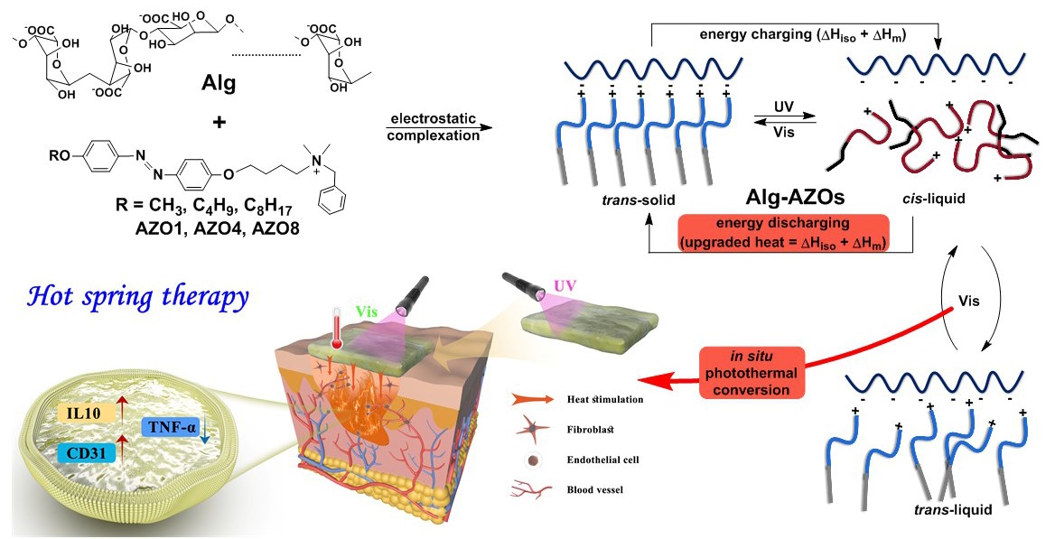 本项研究在前期分子开关类储能材料和生物医用材料的研究基础上,通过设计含有偶氮苯结构的表面活性剂分子与天然海藻酸钠分子通过静电作用力结合,制备得到了一种新型的离子复合物材料。该类材料可以在室温条件下通过光照同时对光能和环境中的低温热能进行高效存储,储能密度高达380.6 J/g,其所储存的能量可以通过可见光照射以热能形式进行可控释放。此外,通过对材料结构进行设计,该材料可以在可见光照射下进行长达4小时以上的稳定热能输出,实现了分子开关类储能材料的可见光-热能原位光热转化。海藻酸钠基材料具有良好的生物安全性,基于此,课题组使用该光热转化材料在小鼠伤口的愈合过程中为伤口提供了“温泉式”温和热刺激,研究发现其作为医用敷料可以有效加快生物组织伤口的愈合过程。本项研究为设计具有高能量密度、长效加热功能和热能可控释放的生物友好型医用敷料提供了分子设计策略方面的支持。