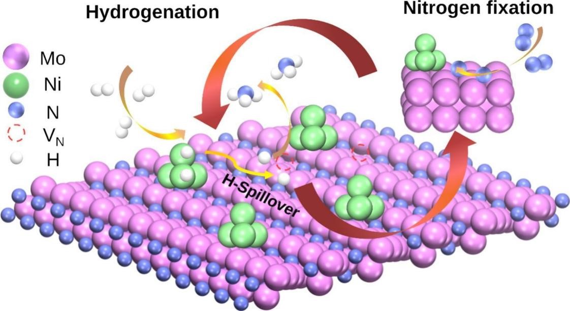 该团队设计了一种基于Ni-Mo2N的复合氮载体(Guan, et al.J. Catal.2026, 454:116651),实现了高效化学链制氨(CLAS)。复合载体Ni-Mo2N表现出卓越性能,是纯Mo2N的3倍。本研究明确了Ni的双重作用机制:一方面,Ni作为氢化活性位点,显著增强H2的吸附与解离能力,并通过氢溢流效应促进H与Mo2N表面晶格氮的接触反应;另一方面,Ni与Mo之间存在电子转移作用,加速晶格氮迁移与转化。前期工作中,发现25wt%Ni掺杂VN使晶格氮转化率从3.3%跃升至49.2% (Han, et al.J. Cleaner Prod.2025, 494:145026);16wt%Ni负载Mn4N则将氨产率提升4倍,并将氨生产起始温度从550℃降至350℃,实现低温活性突破(Xue, et al.Sep. Purif. Technol.2025, 359:130829)。
