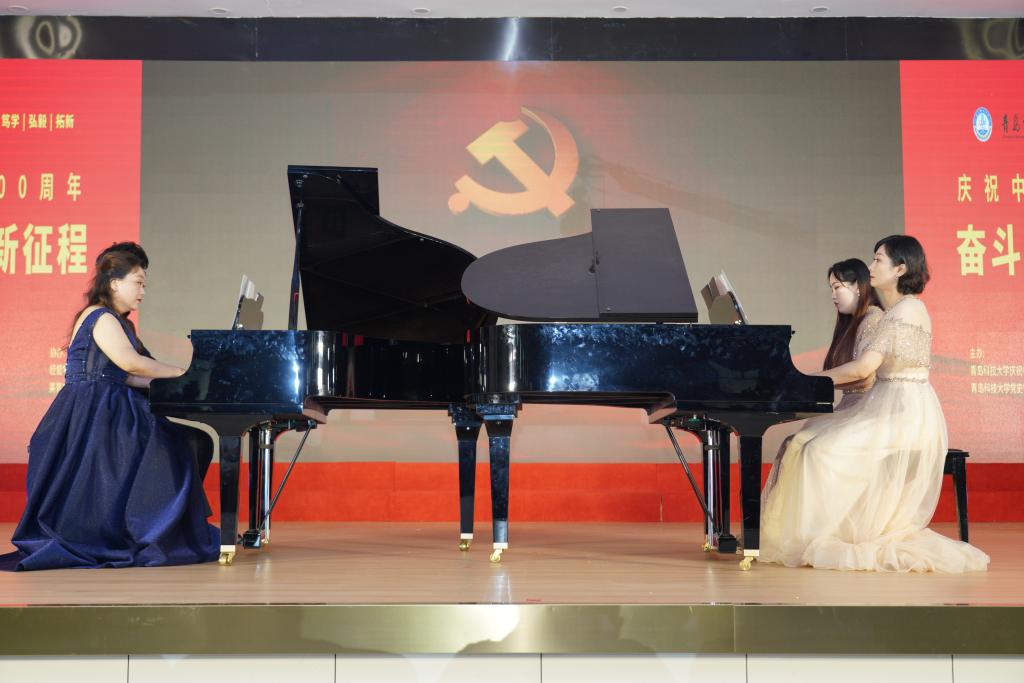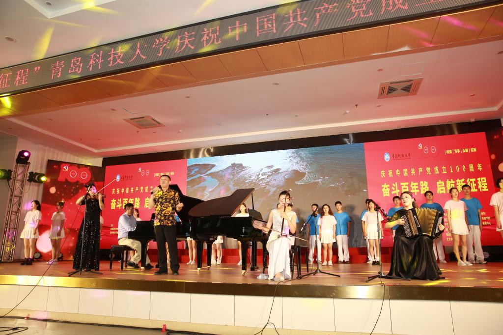 《保卫黄河》《我和我的祖国》《映山红》《妈妈教我一支歌》《绣红旗》《献给党的的歌——中国红色名曲联奏》《走向复兴》《颂歌》《百年征程正芳华》等一首首经典红歌、名曲、诗段,表达了师生们对祖国的美好祝愿、对党的赞美和永远跟党走的坚定信念。艺术学院带来的原创歌曲《百年誓言》唱出了共产党员面向党旗读出誓言,就是一生的承诺与坚守的坚定信念。最后全体演职人员与现场领导、师生齐声共唱《没有共产党就没有新中国》,向伟大的中国共产党献上诚挚的祝福。