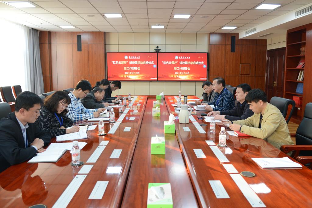 陈刚在会上传达了省教育工委有关文件精神,对学校开展“红色云展厅”进校园活动进行了分工部署。根据活动安排,学校将于2021年12月至2022年10月期间,集中开展“红色云展厅”进校园“十个一”系列活动,包括组织一次红色展馆网上参观、组织一次红色主题论坛、开展一次红色主题班团活动、上好一堂红色思政大课、开展一次红色主题征文、过好一次“红色传承”为主题的组织生活、举行一场红色校园跑、举办一场红色文艺演出、组织一次红色历史知识竞赛、产生一批红色文化研究成果等,分别由学校相关部门及学院牵头组织实施。