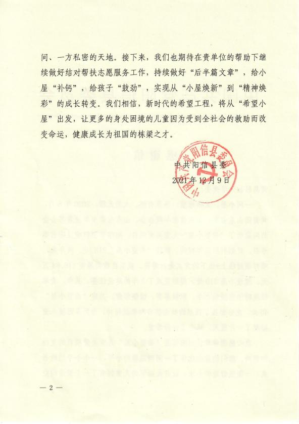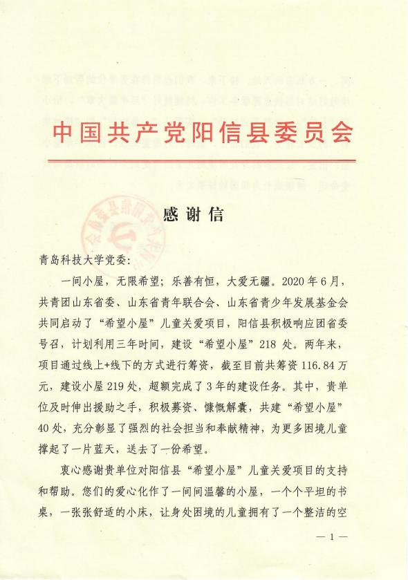 日前,学校党委收到滨州阳信县委发来的感谢信,对学校捐建40间“希望小屋”表示感谢。