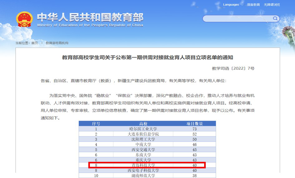日前,教育部发布了《关于公布第一期供需对接就业育人项目立项名单的通知》(教学司函〔2022〕7号),beat365就业育人项目立项40个,立项总数在全国立项成功的1268所高校中排名第8位,在山东省内所有高校中排名第1位。